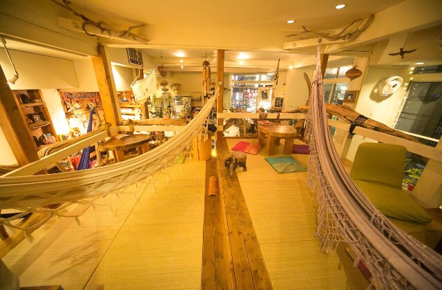 流木を組み上げた中二階、畳スペース、ハンモックの揺れる、美しくて居心地のいい空間、